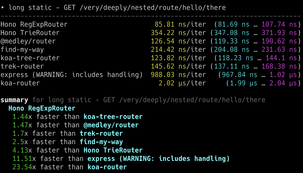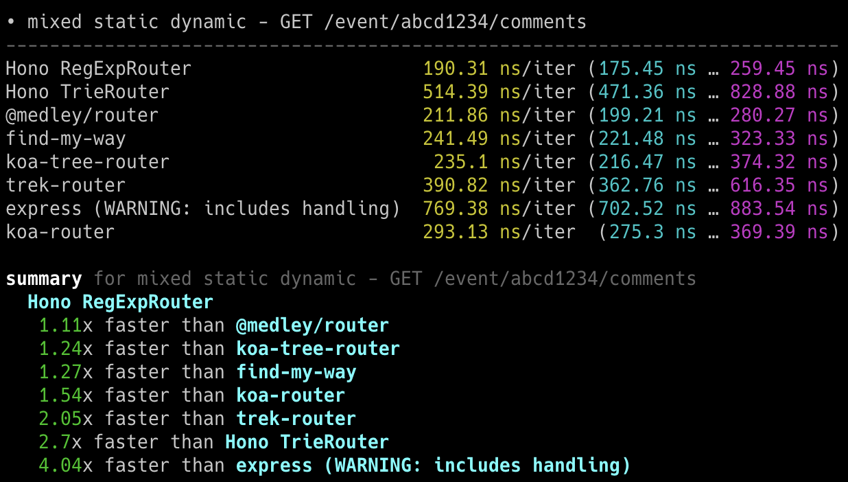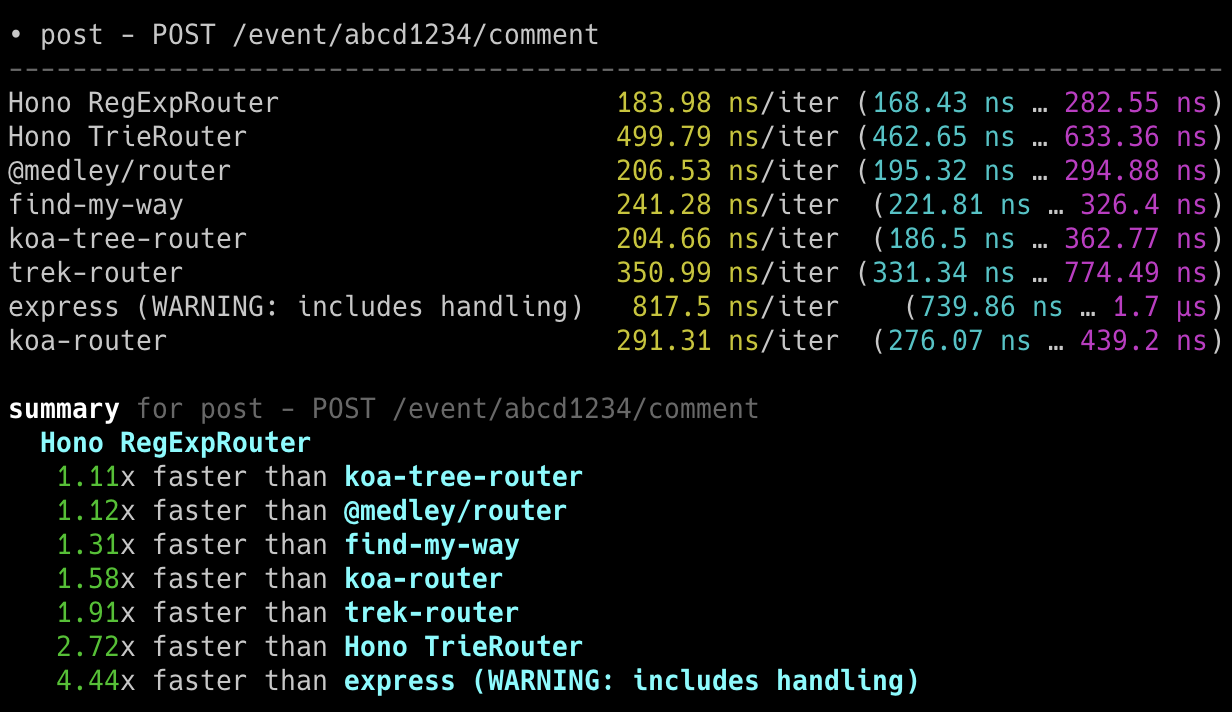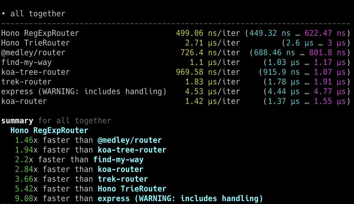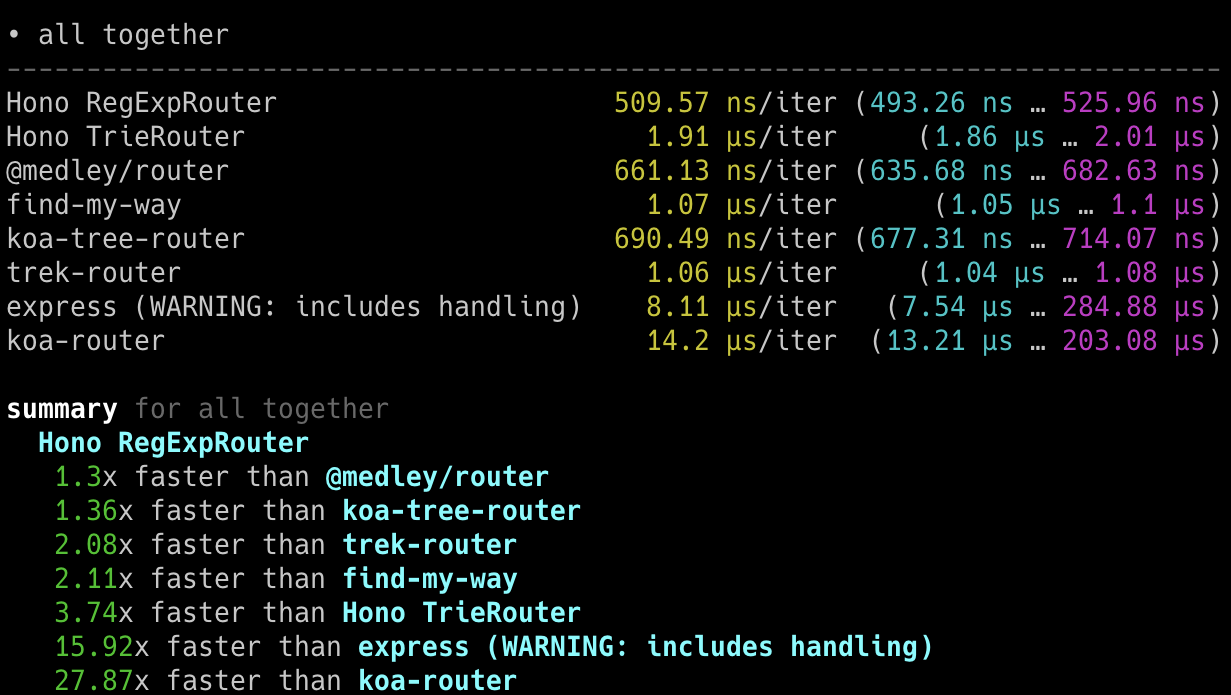 Hono x 402,820 ops/sec ±4.78% (80 runs sampled)