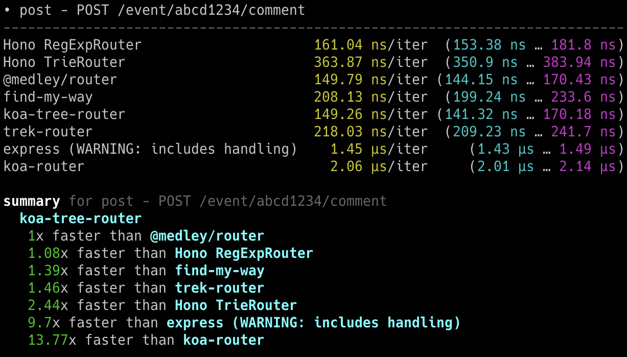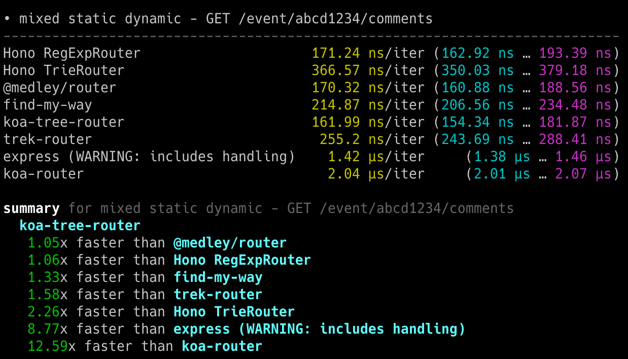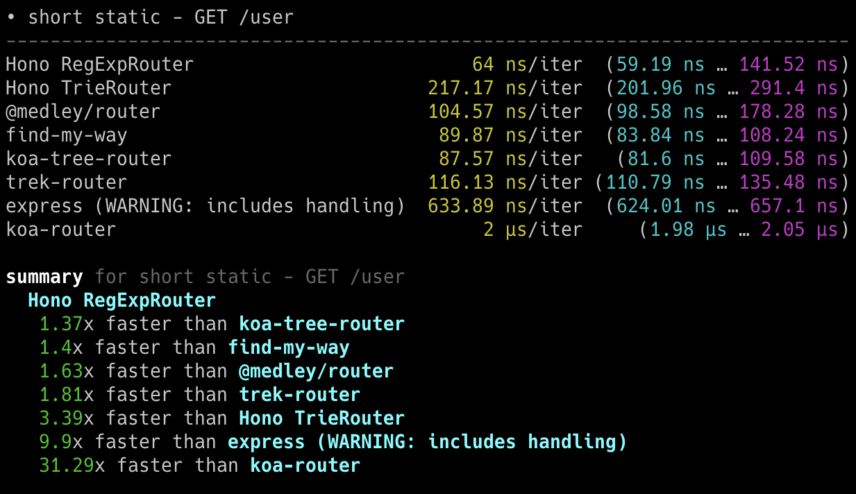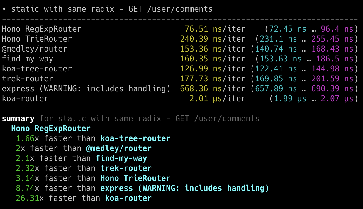 Hono x 402,820 ops/sec ±4.78% (80 runs sampled)